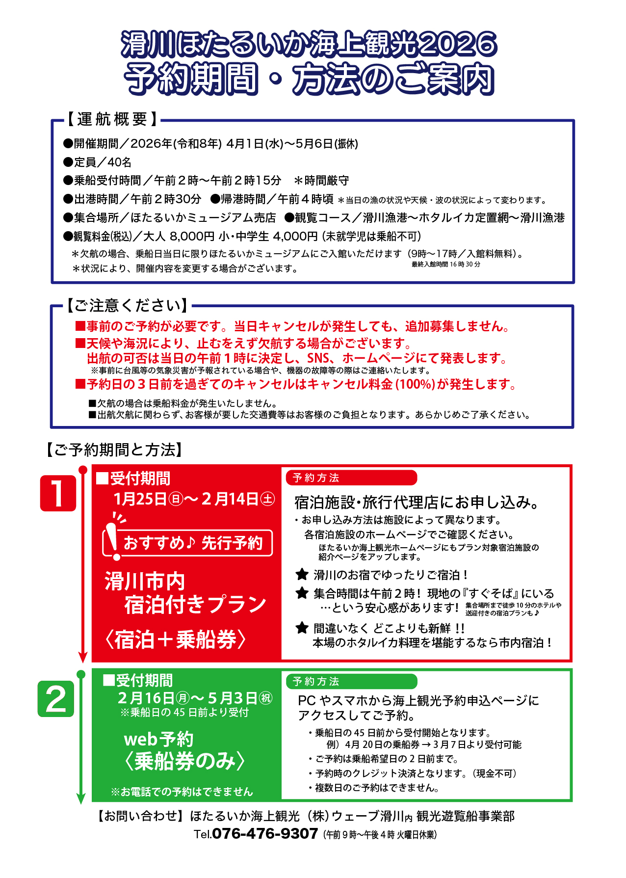 『滑川ほたるいか海上観光2026』運航期間:2026年4月1日(水)〜5月6日(休) ■1月25日(日)〜2月14日(土)は滑川市内宿泊プランの予約受付期間です。各宿泊施設へお申し込みください。 2025.05.06